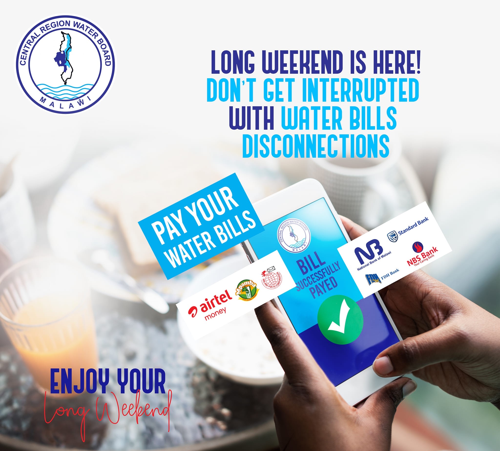 You can also pay your bill through TNM Mpamba and Airtel Money. In the following areas we also receive through Post Offices; Linthipe, Mitundu, Madisi, Kochilira and Kamwendo.
